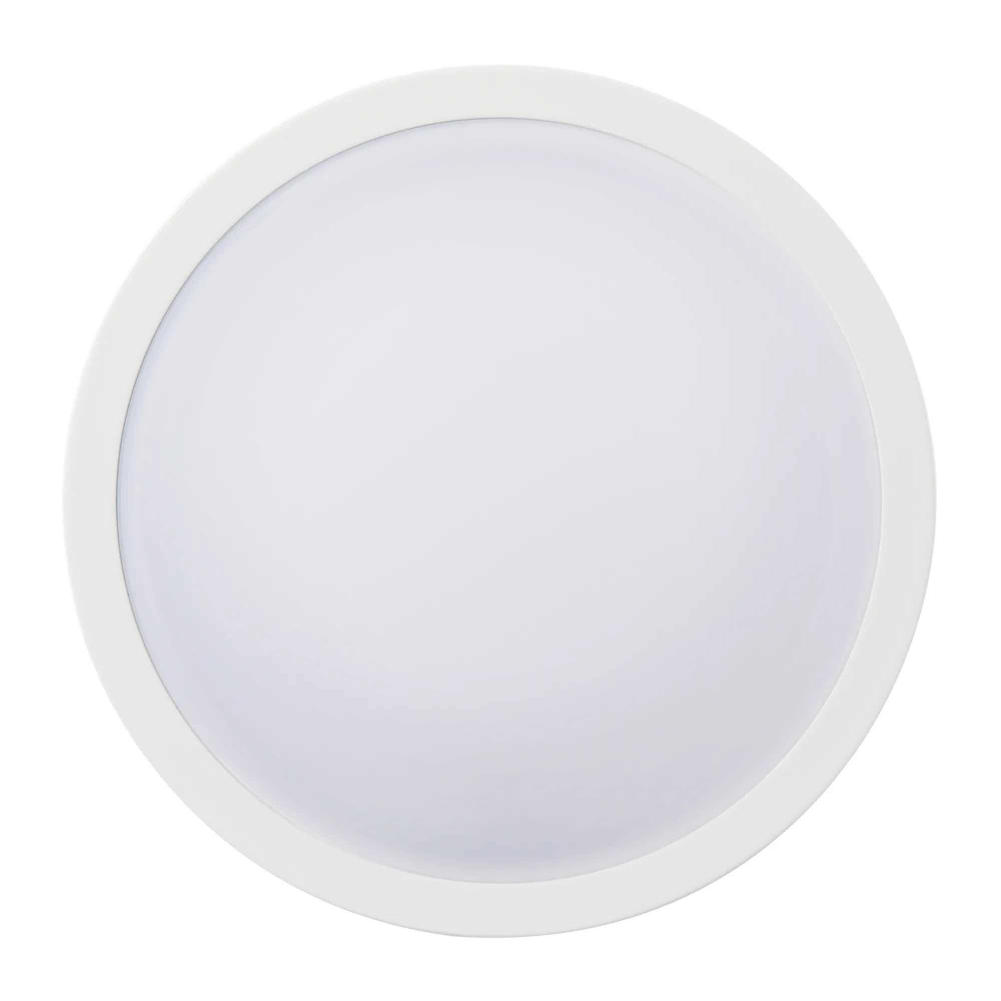 Круглый светильник с контурным свечением. Корпус IP44 белый + вставка поликарбонат PC. Цвет БЕЛЫЙ ТЁПЛЫЙ 3000К, св.поток 1050-1200 лм, угол 120°+180°. Питание 180-240VAC, 15Вт (драйвер 400mA 26-40V в комплекте). Размеры 115х40 мм, установка в отв.105 мм, высота мин.40 мм.