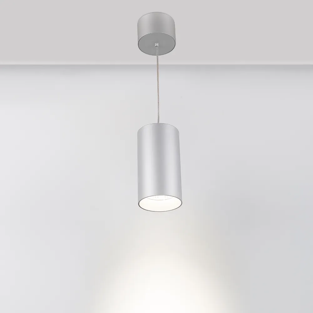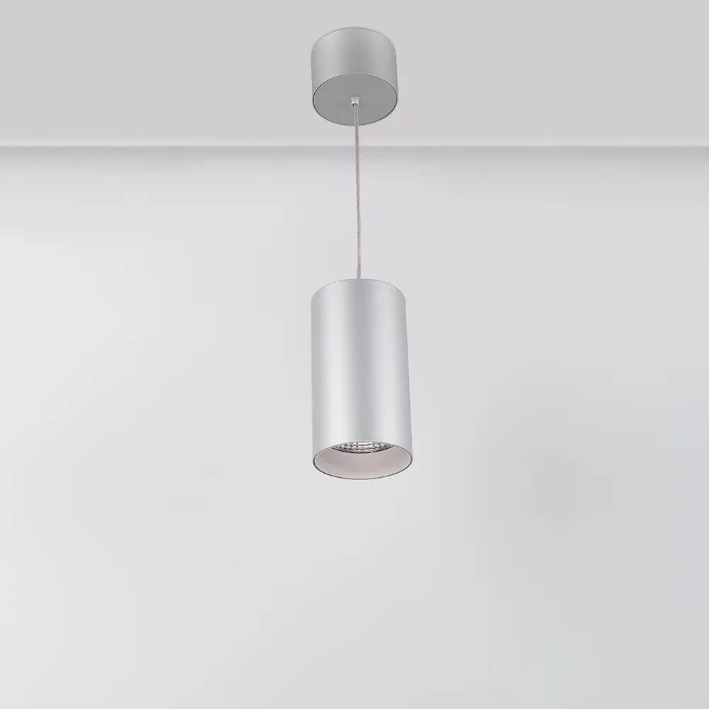 Подвесной светильник 15Вт, серебристый круглый корпус, белая вставка, металл. Цвет ДНЕВНОЙ БЕЛЫЙ 4000K, св.поток 1100лм, CRI(Ra)>80, угол 40°. Размер Ø85x155мм. Встроенный драйвер PRI:220-240VAC, SEC:DC 500mA 23-36V 15Вт.