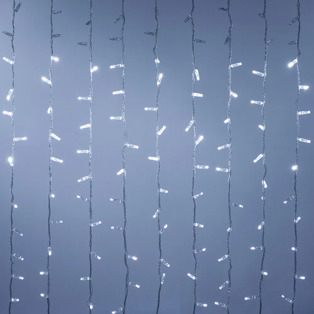 Светодиодный занавес Classic. Размер 2000x6000 мм (длина 2000 мм, высота 6000 мм). 20 ниспадающих нитей длиной 6000 мм. Цвет светодиодов БЕЛЫЙ (6000 К), динамический эффект "водопад". 1500 светодиодов размером 7 мм с резким световым рисунком (прозрачная вогнутая линза). Провод прозрачный, ПВХ. Питание 230 В, Мощность 180 Вт, защита IP65, применение в помещении и на улице под навесом. Аксессуары для подключения в комплекте.