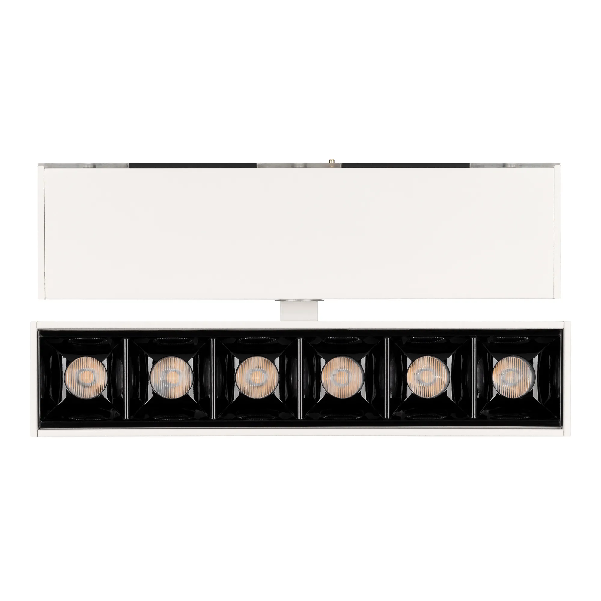 Светильник поворотный для магнитных треков шириной 45мм, 6Вт. Цвет свечения ДНЕВНОЙ 4000K, световой поток 455лм, угол 15°, CRI>90. Корпус прямоугольный, металл, цвет белый, IP20. Размеры LxWxH 163x35x92.5мм. Входное напряжение DC24V, мощность 6Вт. Драйвер DС24V/AC230V поставляется отдельно. Диммируется только с 026407(1), 027633.