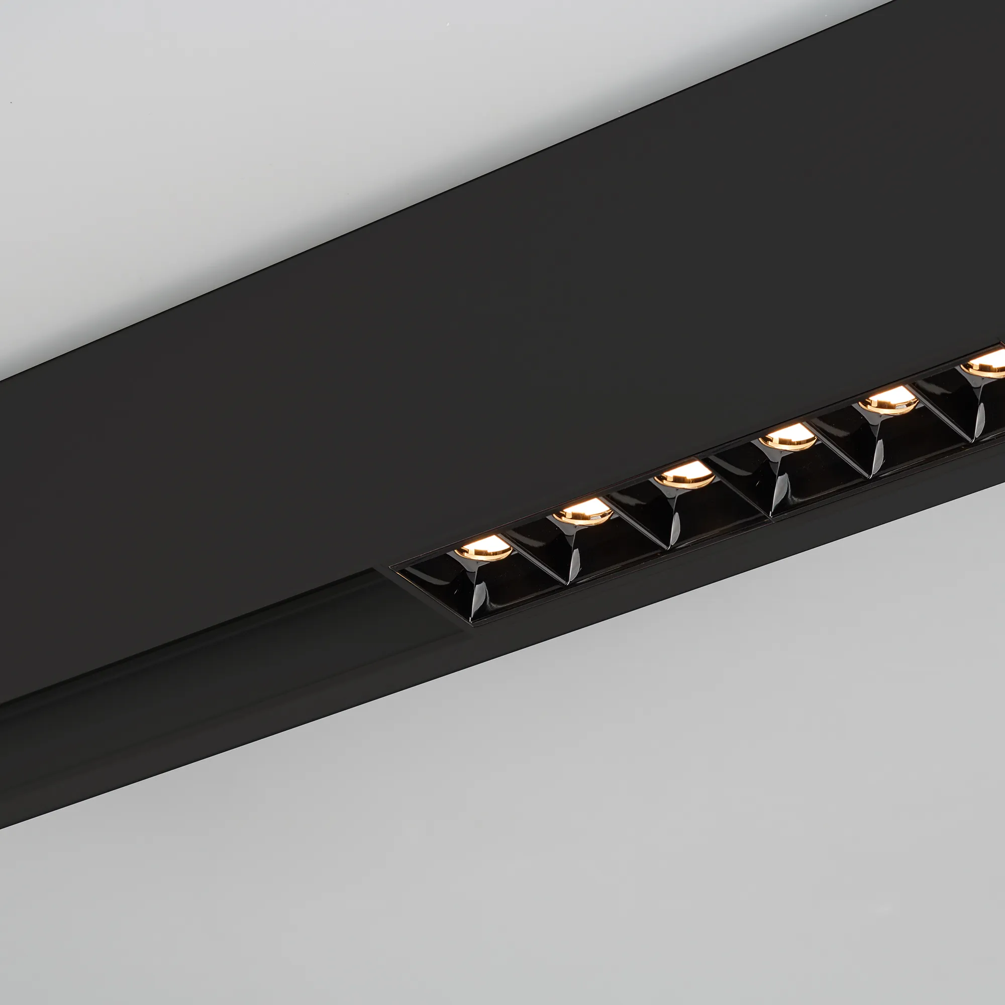 Светильник для магнитных треков шириной 45мм, 27Вт. Цвет свечения ДНЕВНОЙ 4000K, световой поток 1700лм, угол 36°, CRI>90. Корпус прямоугольный, металл, цвет черный, IP20. Размеры LxWxH 481x35x43мм. Входное напряжение DC24V, мощность 27Вт. Драйвер DС24V/AC230V поставляется отдельно. Диммируется только с 026407(1), 027633.