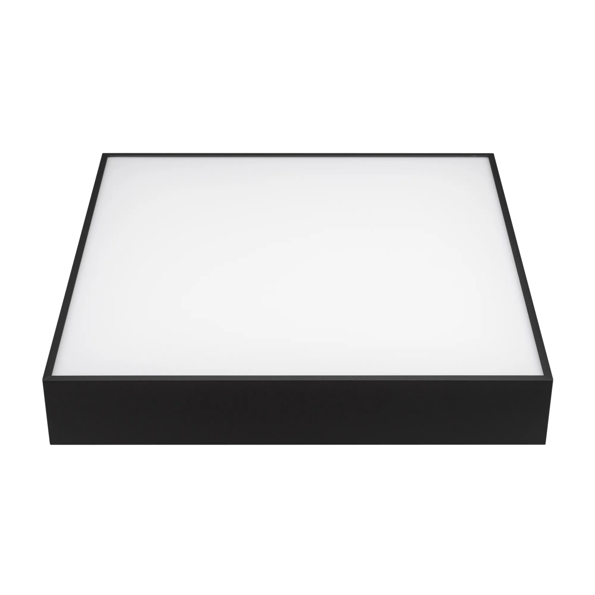 Накладной светильник. Мощность 40 Вт, св. поток 2590-3200 лм, 80 лм/Вт, теплый 3000 K, CRI>90, угол 120°, напряжение питания 230 В. Черный квадратный корпус из алюминия, экран PC, степень защиты IP40. Размер: длина 400 мм, ширина 400 мм, высота 64 мм. Монтаж накладной. Драйвер 27-40 В, 1000 мА, пульсация <5%.