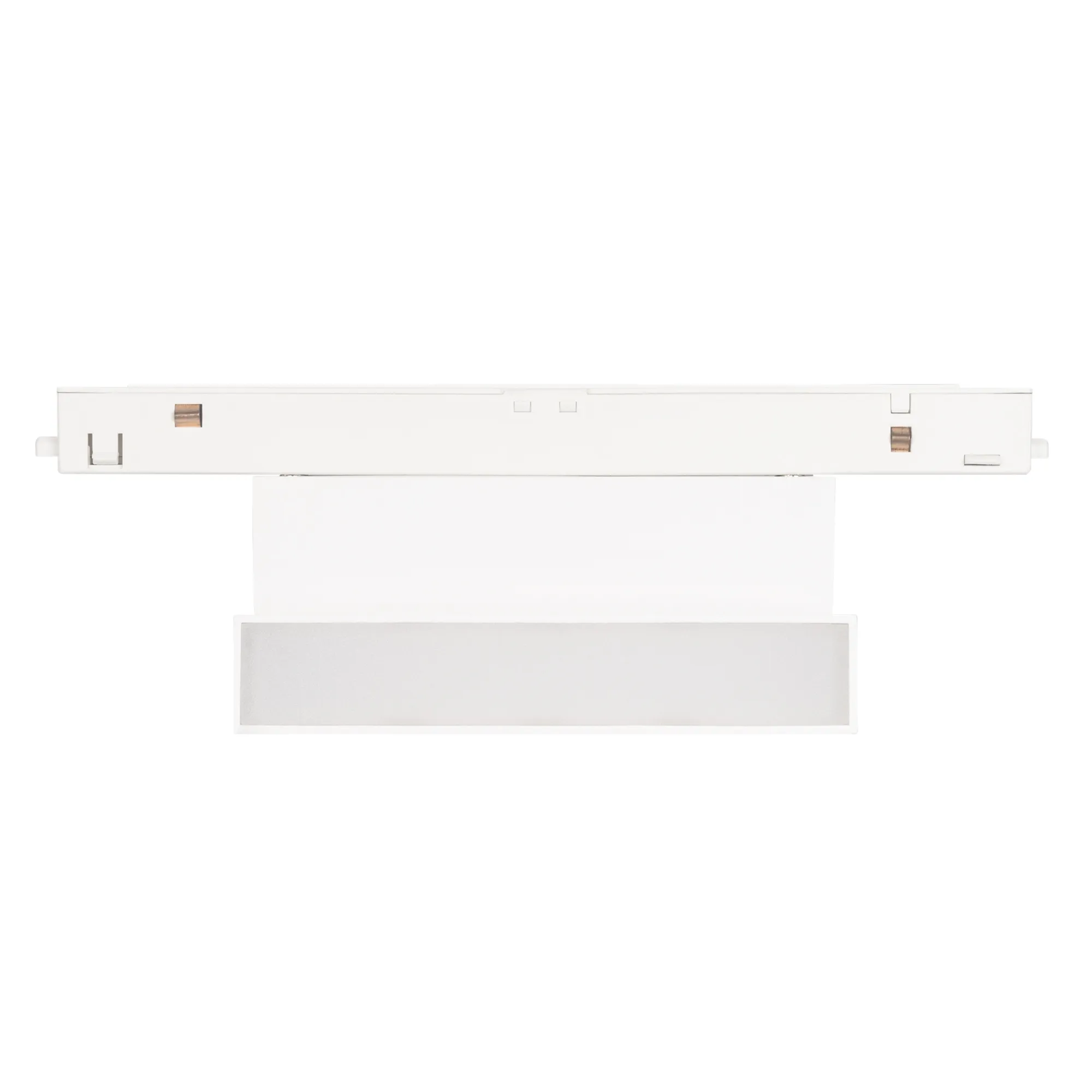 Светильник для магнитных треков MAG-ORIENT шириной 26 мм с управлением DALI. Мощность 6 Вт, св. поток 375 лм, 63 лм/Вт, дневной 4000 K, CRI>90, угол 80°, напряжение питания 48 В. Белый прямоугольный корпус из металл, экран поликарбонат, степень защиты IP20. Размер: длина 204 мм, ширина 23 мм, высота 99 мм. Монтаж на трек MAG-ORIENT, пульсация <1%.