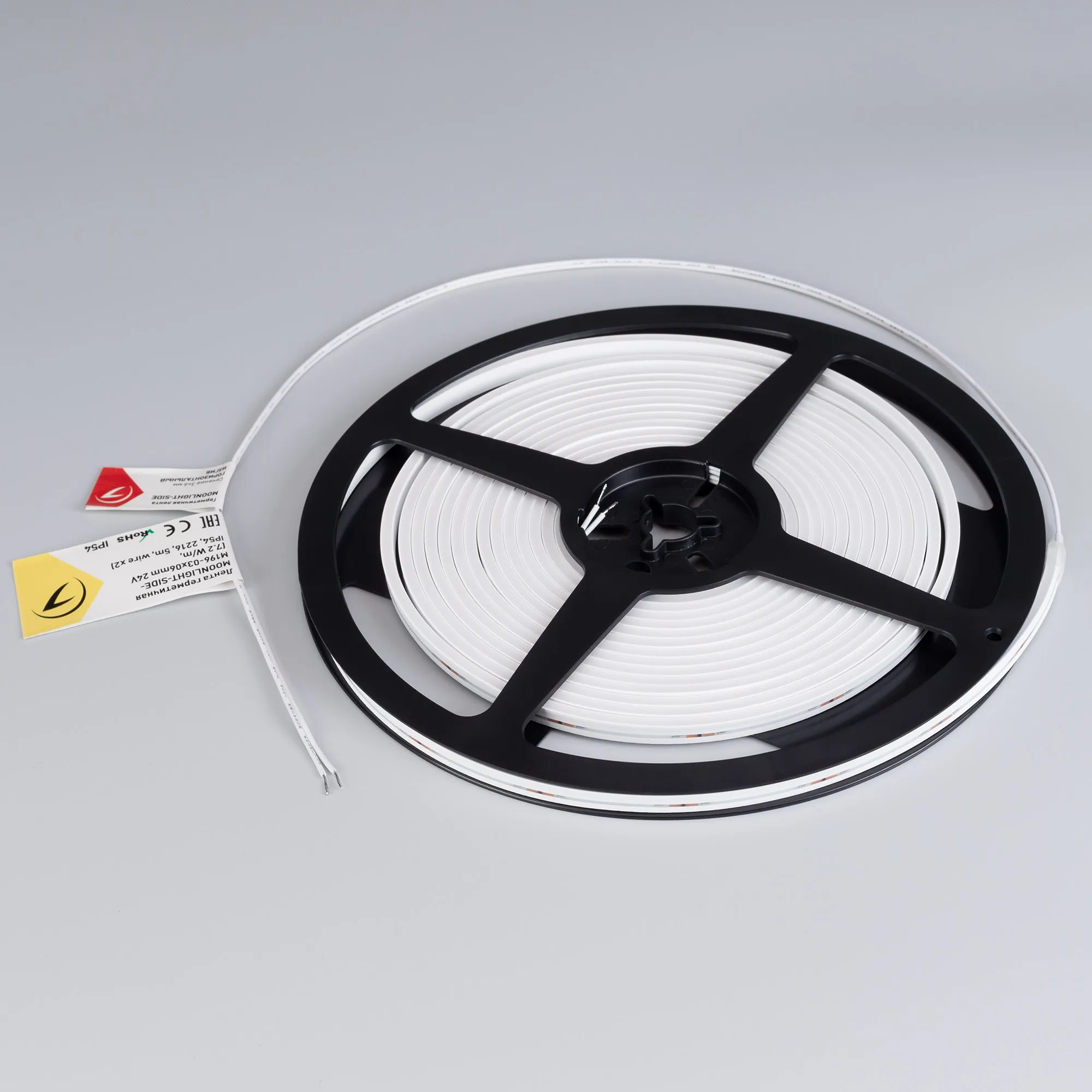 Гибкая герметичная лента (неон серии MOONLIGHT), сечение 3×6 мм. Светодиоды SMD 2216 196 шт/м. Цвет свечения ТЁПЛЫЙ (2300 К), индекс цветопередачи CRI>90, световой поток 170 лм/м, угол излучения 112°. Мощность 7.2 Вт/м, питание 24 В. Класс пылевлагозащиты IP54. Размеры 5000×3×6 мм. Мин. отрезок 35.7 мм. Горизонтальный изгиб SIDE, минимальный радиус изгиба 30 мм. Кабель питания длиной 500 мм, вывод с двух сторон вдоль линии сечения неона. Катушка 5 м. Цена за 1 м. Гарантия 3 года.