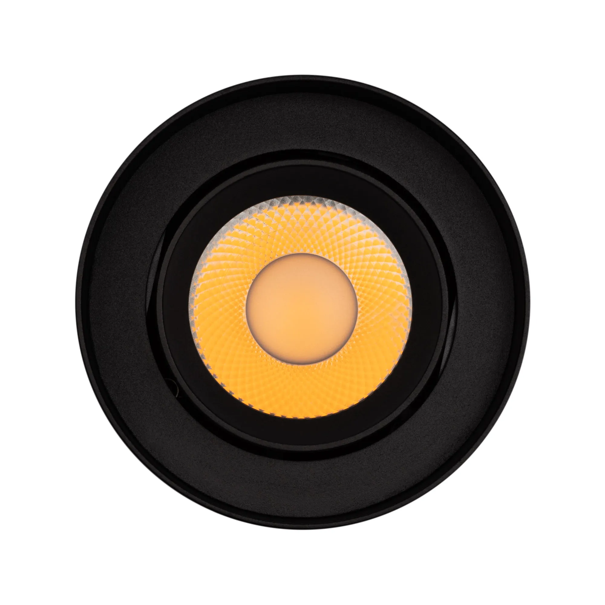 Накладной интерьерный светильник. Мощность 18 Вт, св. поток 1700 лм, 99 лм/Вт, дневной 4000 K, CRI>90, угол 15°, регулируемое направление луча 40°(20+20), поворотный световой модуль вокруг своей оси на 340°, UGR <11, напряжение питания 230 В. Чёрный круглый корпус из алюминия, степень защиты IP54. Размер: диаметр 110 мм, высота 145 мм. Монтаж накладной. Драйвер 27-43 В, 450 мА, пульсация <1%.