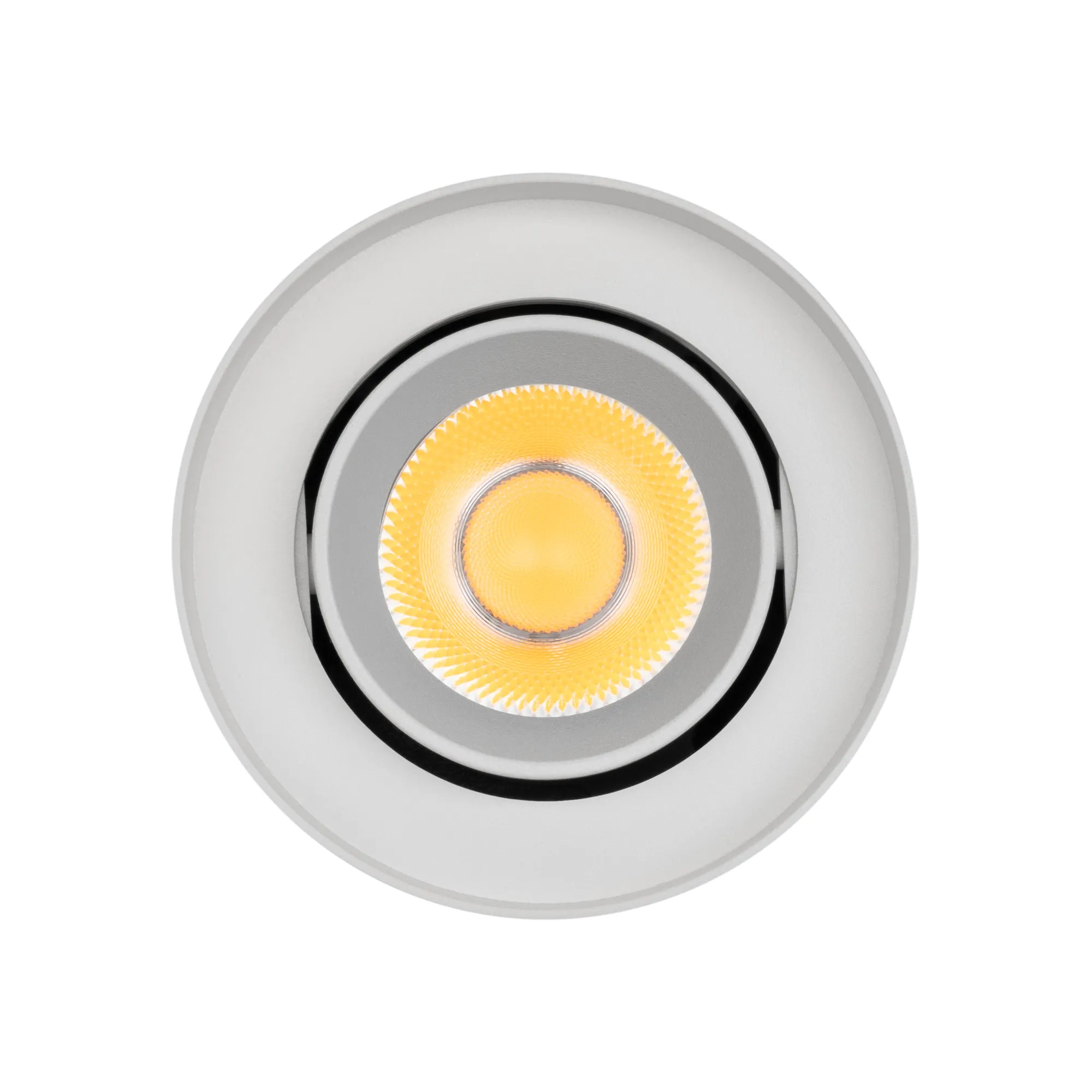 Накладной интерьерный светильник. Мощность 10 Вт, св. поток 970 лм, 93 лм/Вт, дневной 4000 K, CRI>90, угол 24°, регулируемое направление луча 40° (20+20), поворотный световой модуль вокруг своей оси на 340°, UGR <18, напряжение питания 230 В. Белый круглый корпус из алюминия, степень защиты IP54. Размер: диаметр 86,5 мм, высота 120 мм. Монтаж накладной. Драйвер 27-43 В, 250 мА, пульсация <1%.