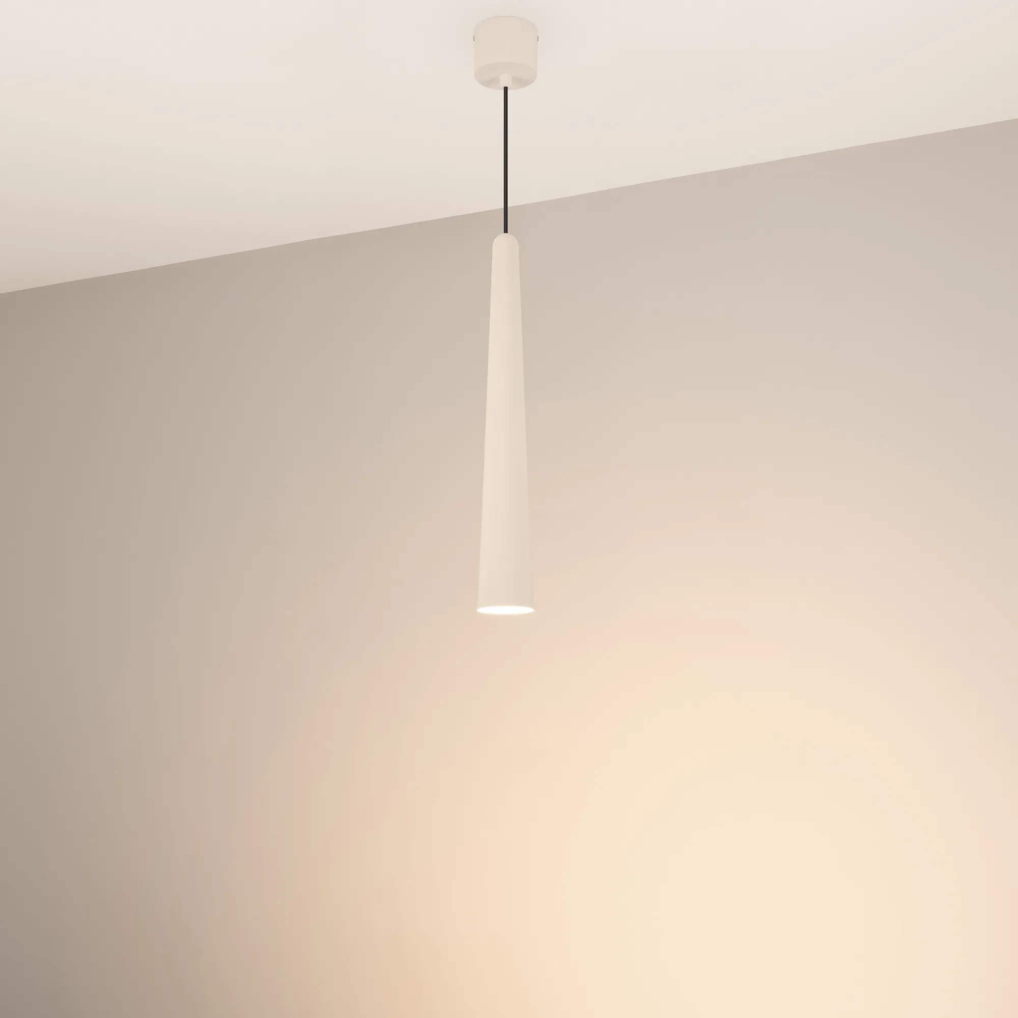 Подвесной светильник. Мощность 5 Вт, св. поток 400 лм, световая эффективность 70 лм/Вт, теплый 3000K, CRI>92, угол 36°, напряжение питания 230 В. Кремовый конусообразный вытянутый корпус из алюминия, линза из PMMA, степень защиты IP20. Размер: диаметр 57 мм, высота 400 мм. Монтаж подвесной, длина подвеса 2000 мм, регулируемая. В комплекте 2 вида чаш. Габариты встраиваемой чаши: Ø 80x41 мм. Габариты накладной чаши Ø80x60 мм. Драйвер 2,8-12В, 500 мА, пульсация <1%.