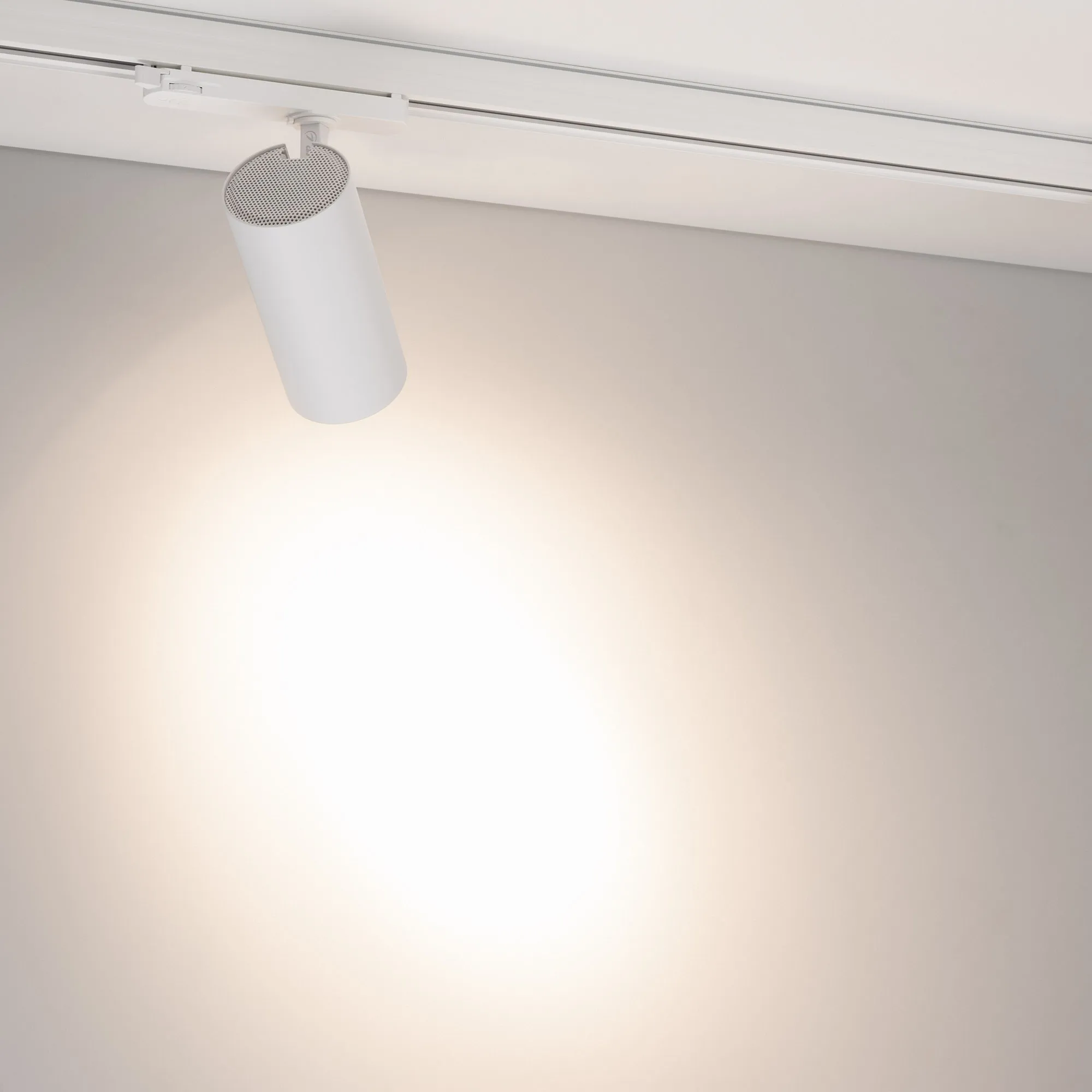 Светильник для треков/шин 4 провода. Мощность 20 Вт, св. поток без решетки honeycomb 2000 лм, 100 лм/Вт, с решеткой honeycomb 1320 лм, 66 лм/Вт, дневной 4000 K, CRI>90, угол 15°, напряжение питания 230 В. Белый круглый корпус из алюминия, материал линзы PMMA, степень защиты IP20. Размер: диаметр 74 мм, длина световой части 154 мм. Монтаж на трек 3-фазный. Драйвер встроенный 24-42 В, 500мА., пульсация <5%