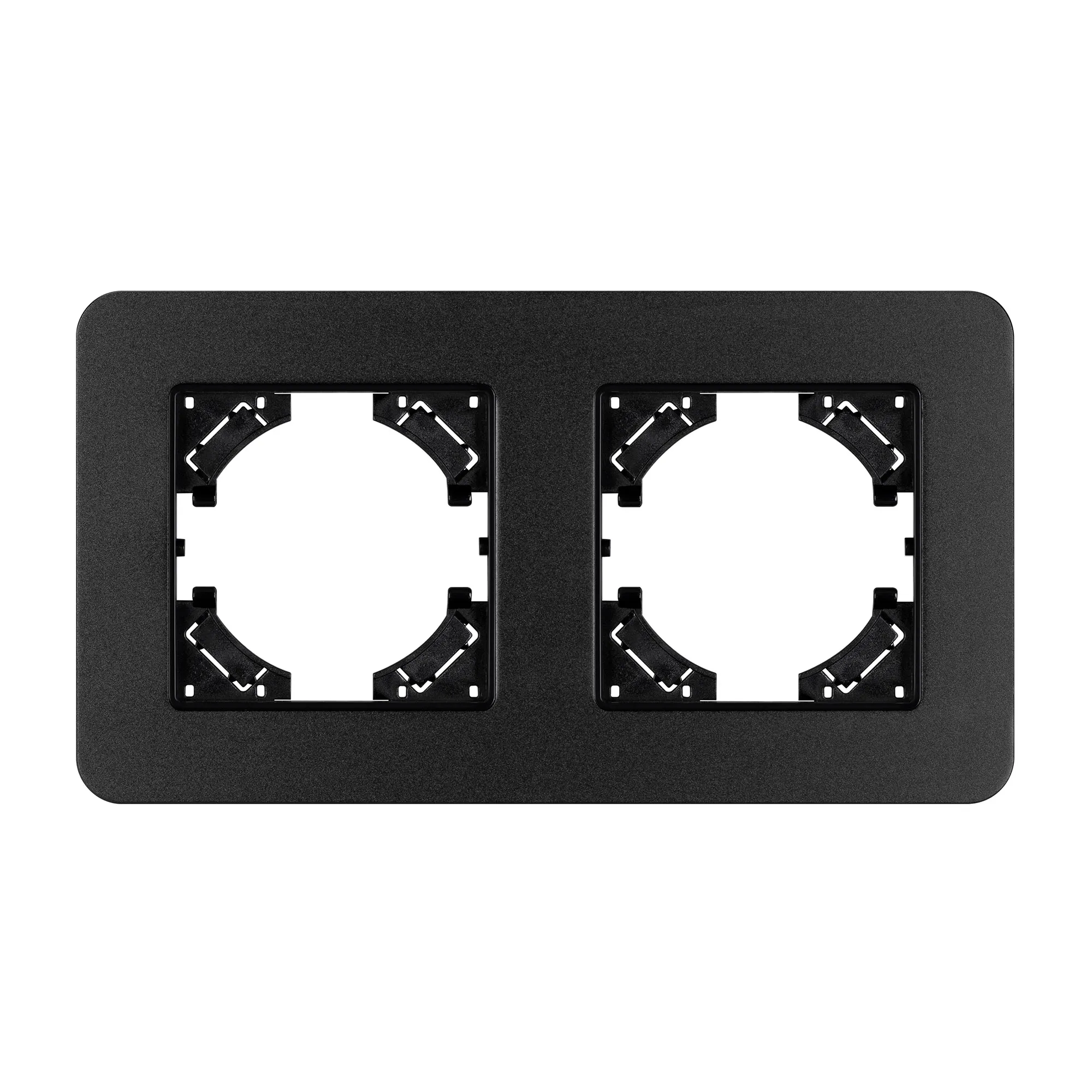 Рамка алюминиевая на 2 поста, под встраиваемый механизм. Цвет - черный с Soft-Touch покрытием. Среднего уровня герметичности IP20. Ориентация монтажа - горизонтальная (основным ориентиром служат посадочные выступы для накладки механизма).
