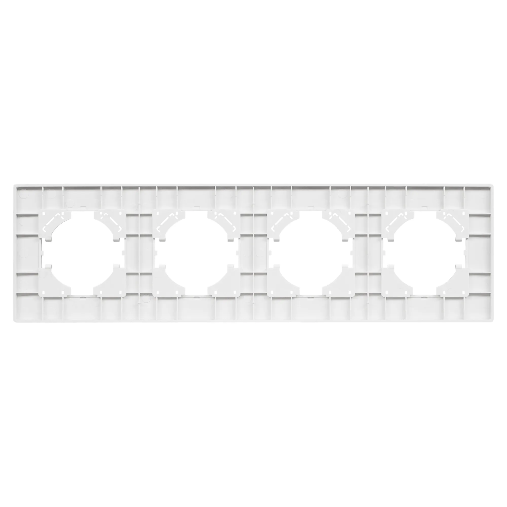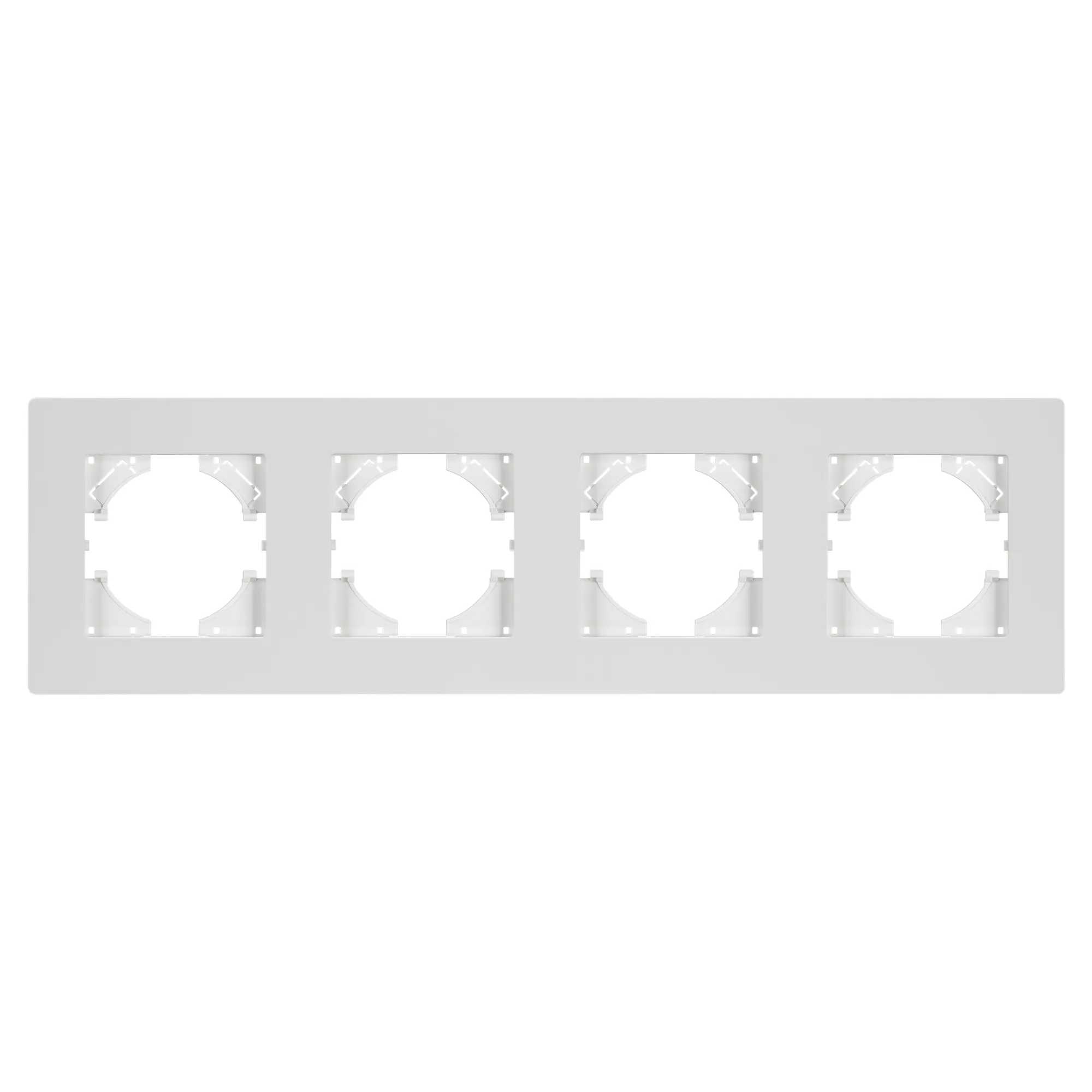 Рамка пластиковая на 4 поста, под встраиваемый механизм. Цвет - белый. Среднего уровня герметичности IP20. Ориентация монтажа - горизонтальная (основным ориентиром служат посадочные выступы для накладки механизма).