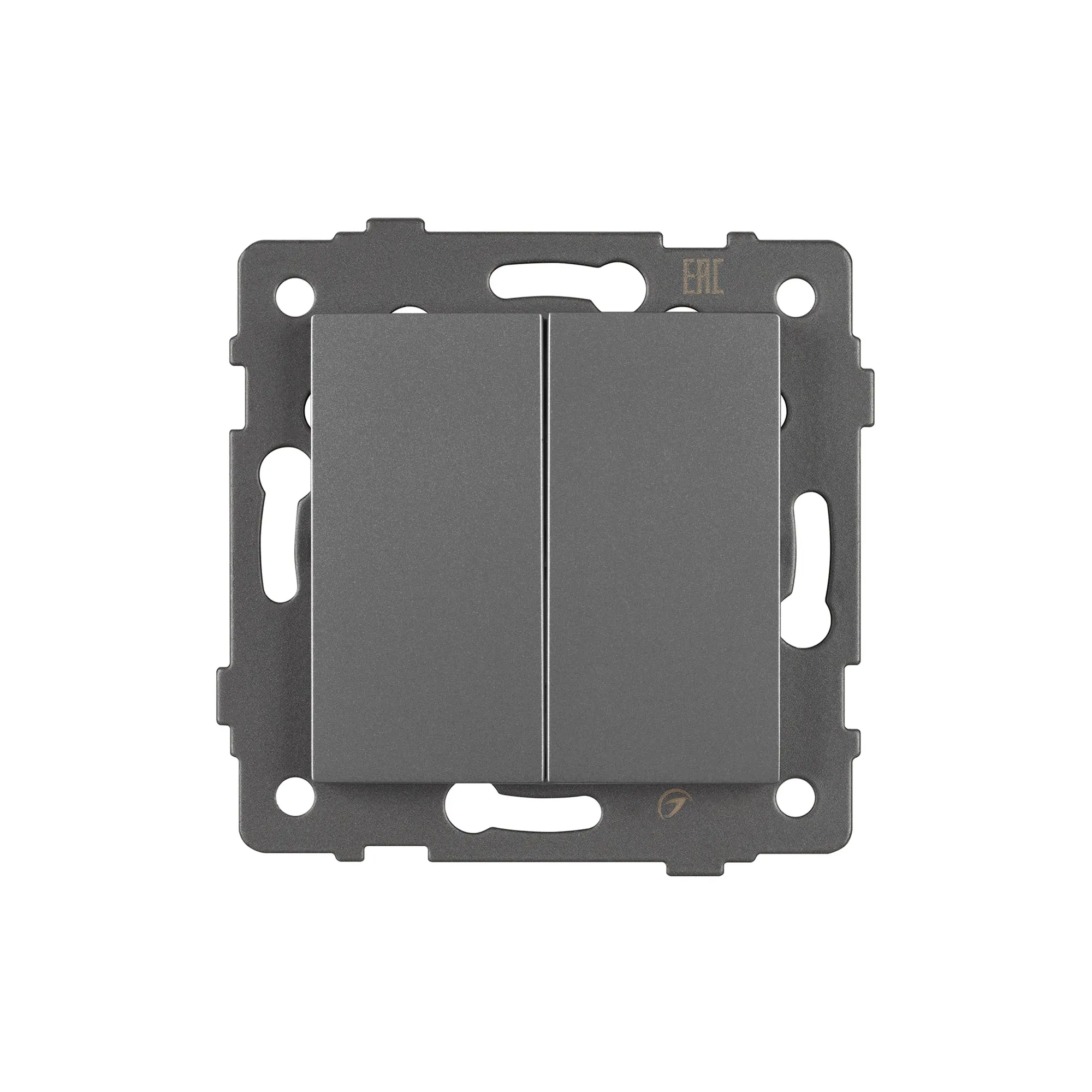 Механизм выключателя света клавишный на 1 пост 2 возвратные клавиши. Цвет - серый. Без фронтальной рамки. Уровень пылевлагозащиты IP20. Выключатель устанавливается в стандартный круглый подрозетник.