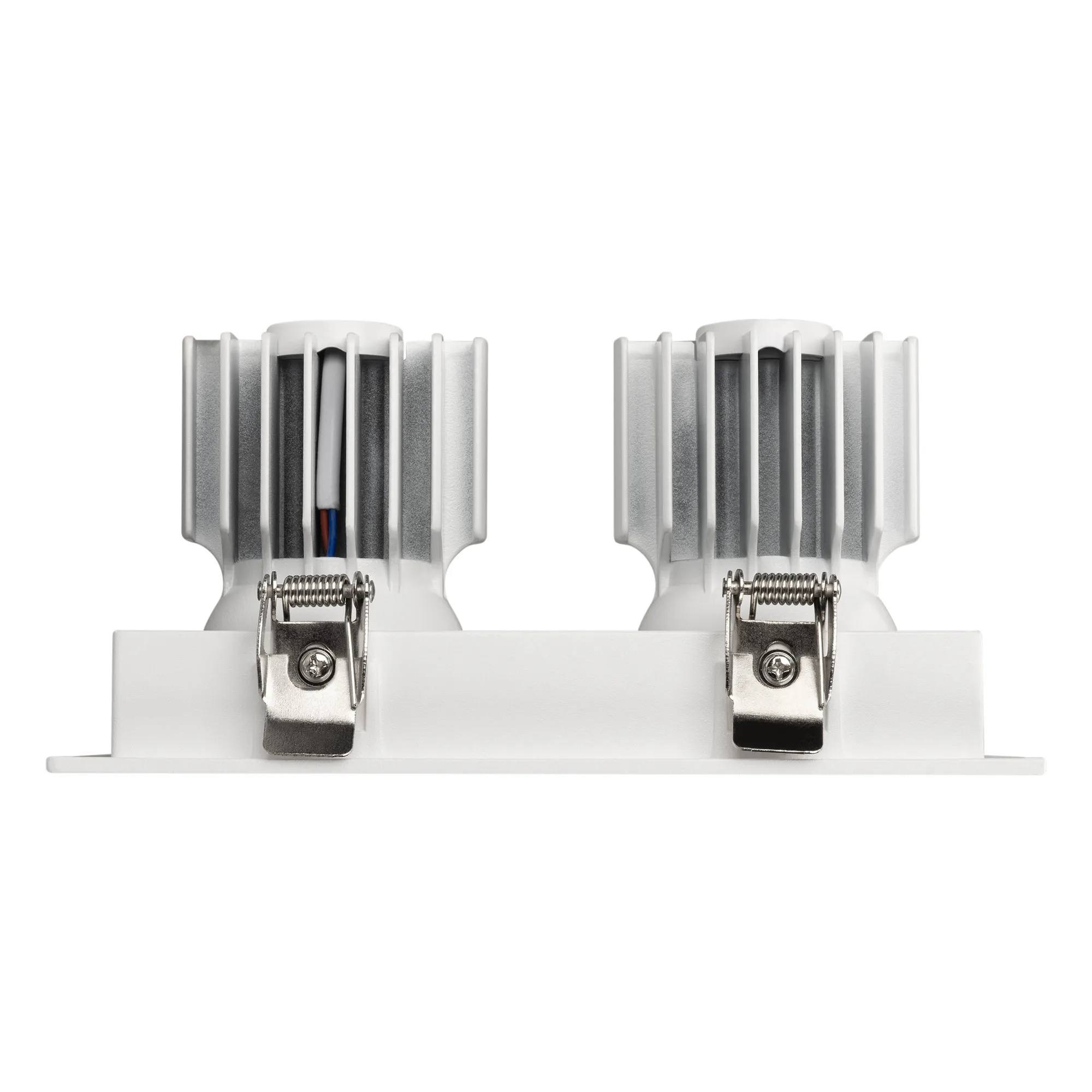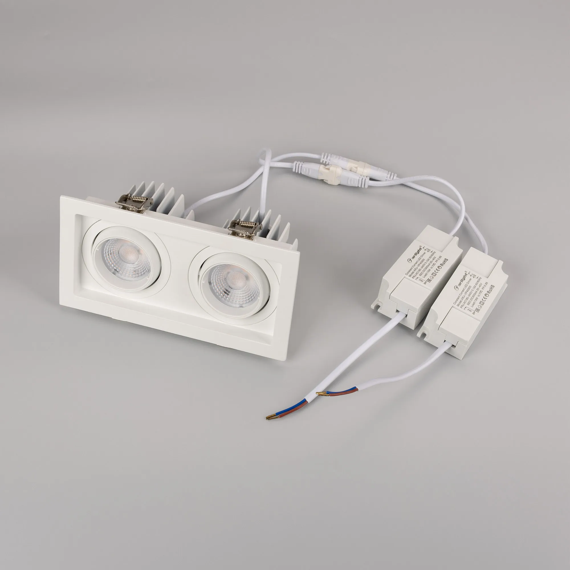 Встраиваемый карданный светильник. Мощность 2х12 Вт, св. поток 2788 лм, 116 лм/Вт, тёплый 4000 K, CRI>92, угол 40°, напряжение питания 230 В. Белый корпус из алюминия, белая вставка, степень защиты IP20. Размер: длина 170 мм, ширина 90 мм, высота 80 мм. Монтаж встраиваемый, установочное отверстие: длина 155 мм, ширина 75 мм. Драйвер 27-40 В, 300 мА, пульсация <2%.