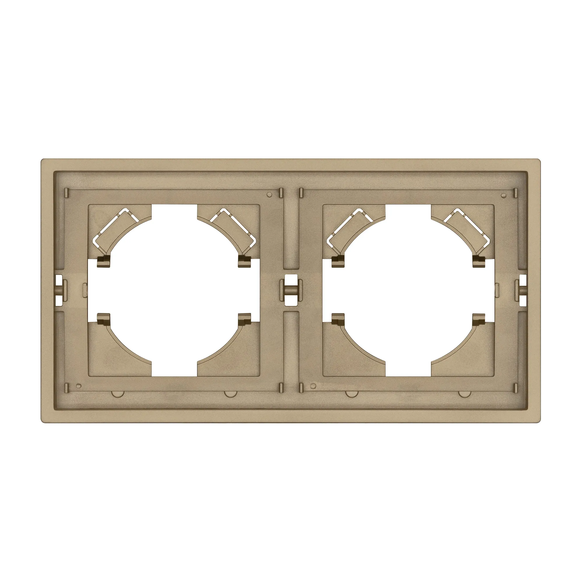 Рамка пластиковая на 2 поста, под встраиваемый механизм. Цвет - золотой, с Soft-Touch покрытием. Среднего уровня герметичности IP20. Ориентация монтажа горизонтальная.